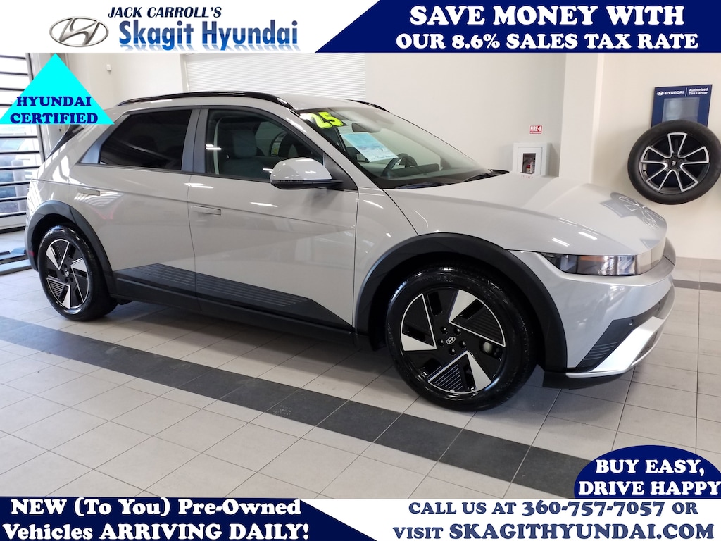 Certified. Priced below KBB Fair Purchase Price! *Only 8.9% Sales Tax!!, Extra Low Miles, Backup Camera, Lane Departure Warning, Blindspot Monitor, Lane Keeping Assist, Collision Warning System, Adaptive Cruise Control, Bluetooth Wireless, Apple CarPlay & Android Auto, H-Tex Artificial Leather Seating Surfaces, harman/kardon® Speakers, Heated front seats, Heated steering wheel, Navigation System, Power driver seat, Power Liftgate, Power passenger seat, Spoiler, Wheels: 19" x 7.5J Alloy. Cyber Gray 2025 Hyundai IONIQ 5 SEL 4D Sport Utility 1-Speed Automatic SEL AWD Electric Motor